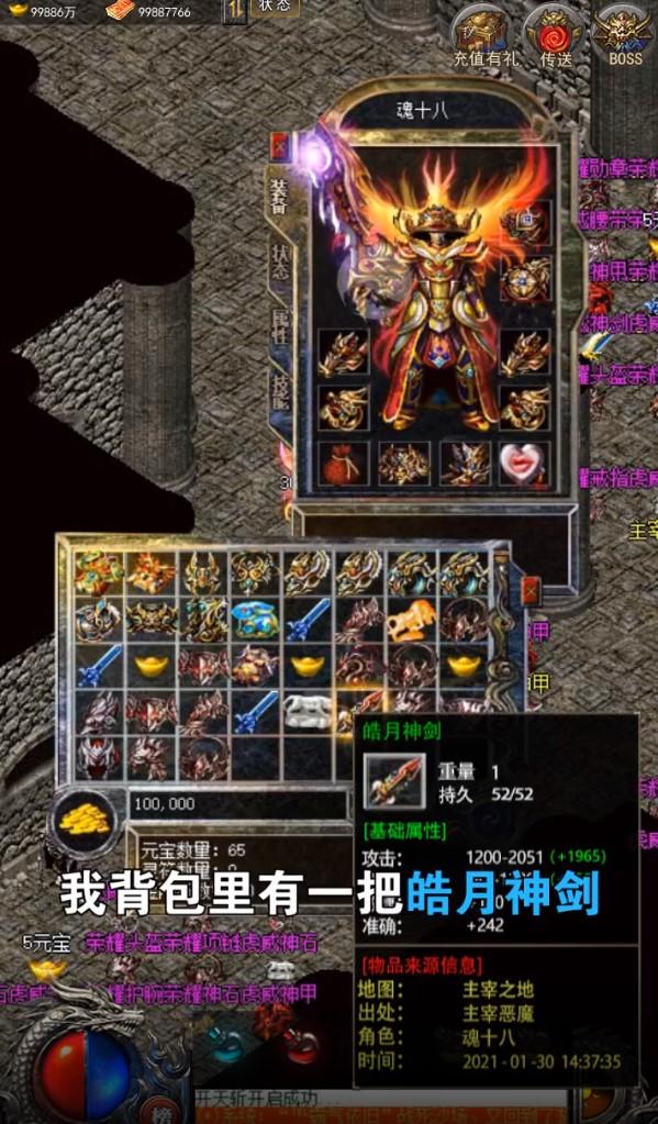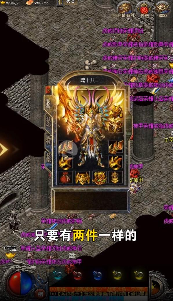 经典的传奇情怀再次延续,万人同屏竞技,快速升级,无限元宝福利,平民也可以玩,玩怪和爆元宝爆装备。