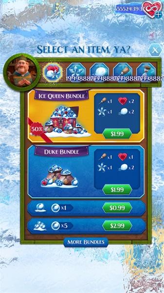 你可以运用安娜的「火把」将整排冰晶烧尽,或是用爱莎的「冰河」强化道具让颜色相同的所有冰晶神奇地消失!你可以试试汉斯的「长剑」将多颗冰晶直接砍除,还有更多更酷的强化道具等你发现!