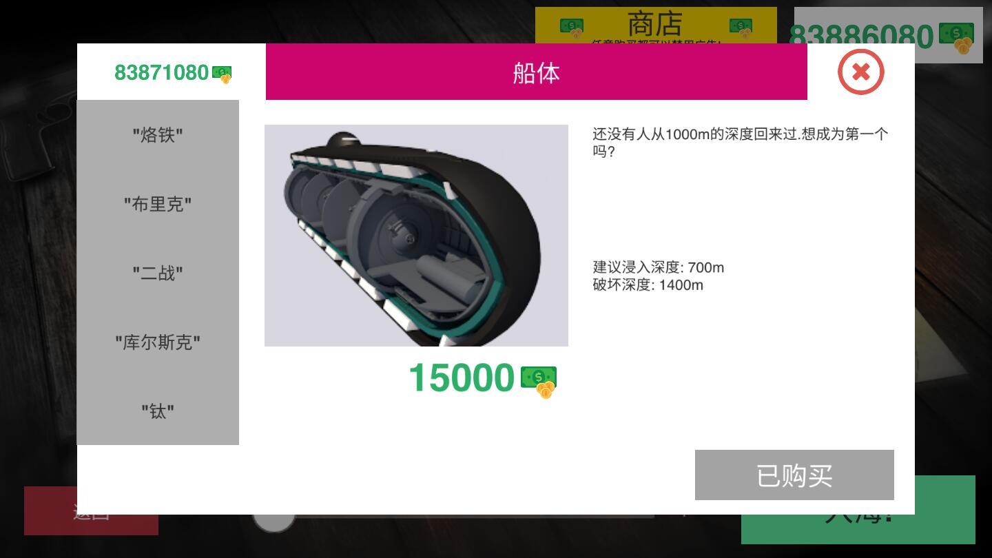 核潜艇模拟器游戏为大家汉化成了中文,而且还破解成大量的金币,这是一款非常精彩神秘的模拟游戏,玩家将驾驶一辆核潜艇在海里面前进冒险,完成各种军事任务,有多种挑战模式可以选择,持续对核潜艇进行升级,提高核潜艇各方面的功能作用;