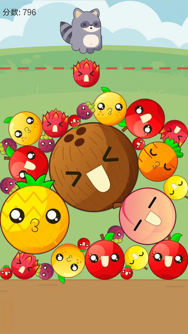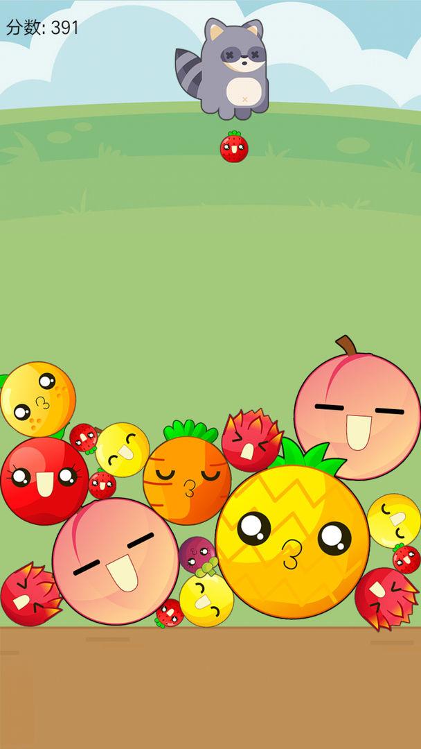 2、一开始玩建议大家有序的排列水果,遵从一个角落水果最大,越往外水果越小的感觉(类似2048),这样容易产生连续合成而节约空间。而且一旦大水果在中间很容易堆太高导致游戏失败。