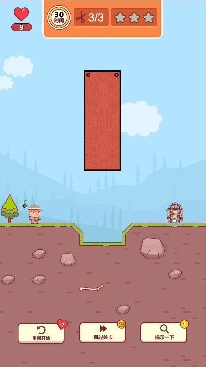 游戏玩法:使用手指一画切掉木块,让切掉的木块搭成桥梁,让主角动起来顺利过去解救宝贝。