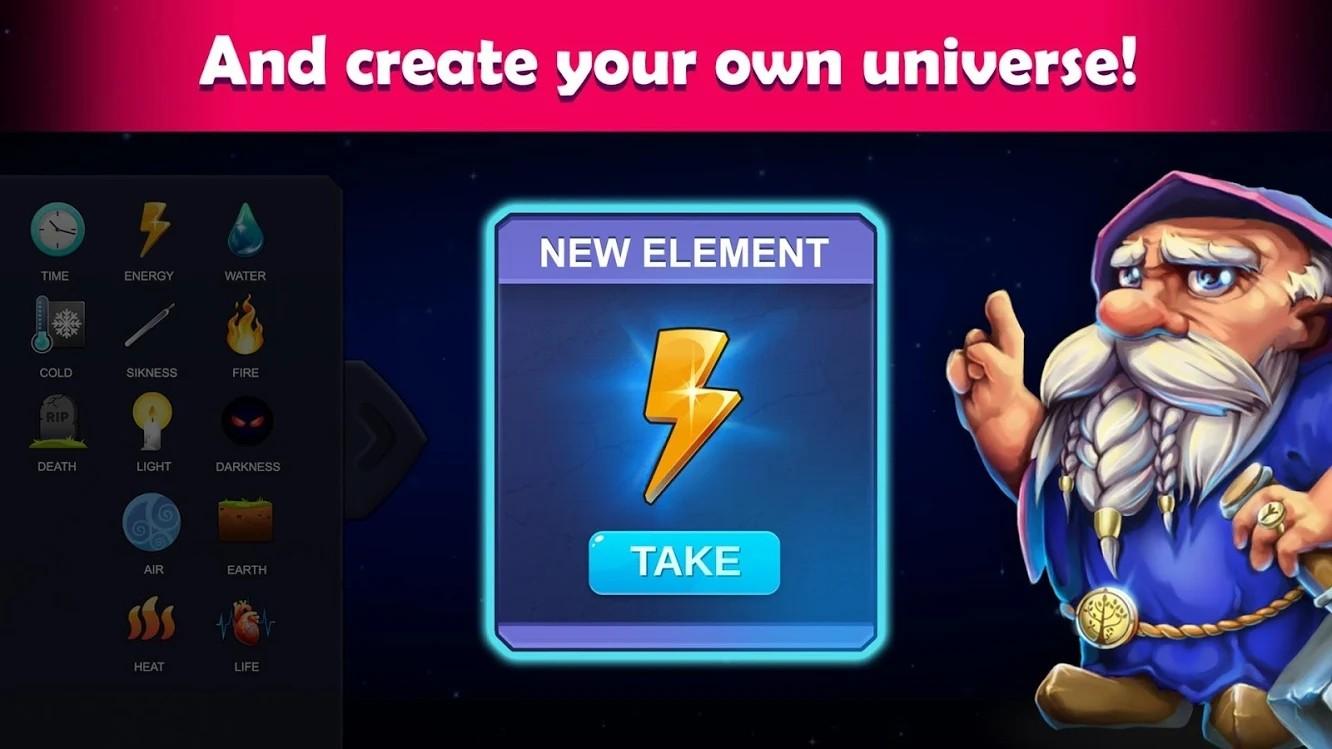 从六个主要元素创建新元素:空气,地球,火,水,黑暗和光明。使用所有开放元素来创建更多元素!