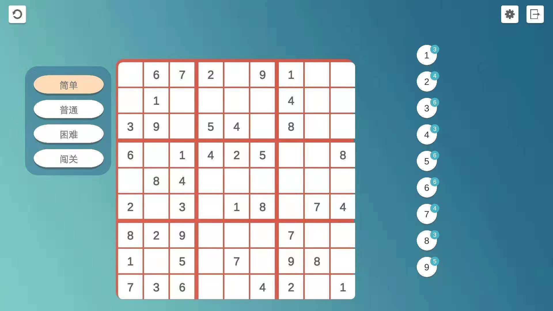 数独(shù dú)是源自18世纪瑞士的一种数学游戏。是一种运用纸、笔进行演算的逻辑游戏。玩家需要根据9×9盘面上的已知数字,推理出所有剩余空格的数字,并满足每一行、每一列、每一个粗线宫(3*3)内的数字均含1-9,不重复 。