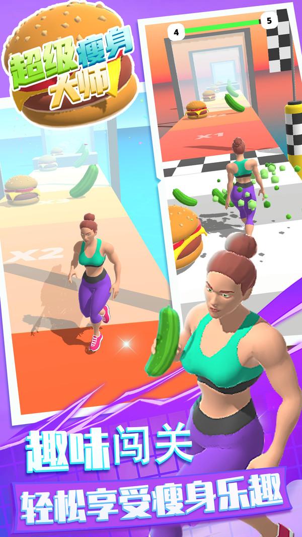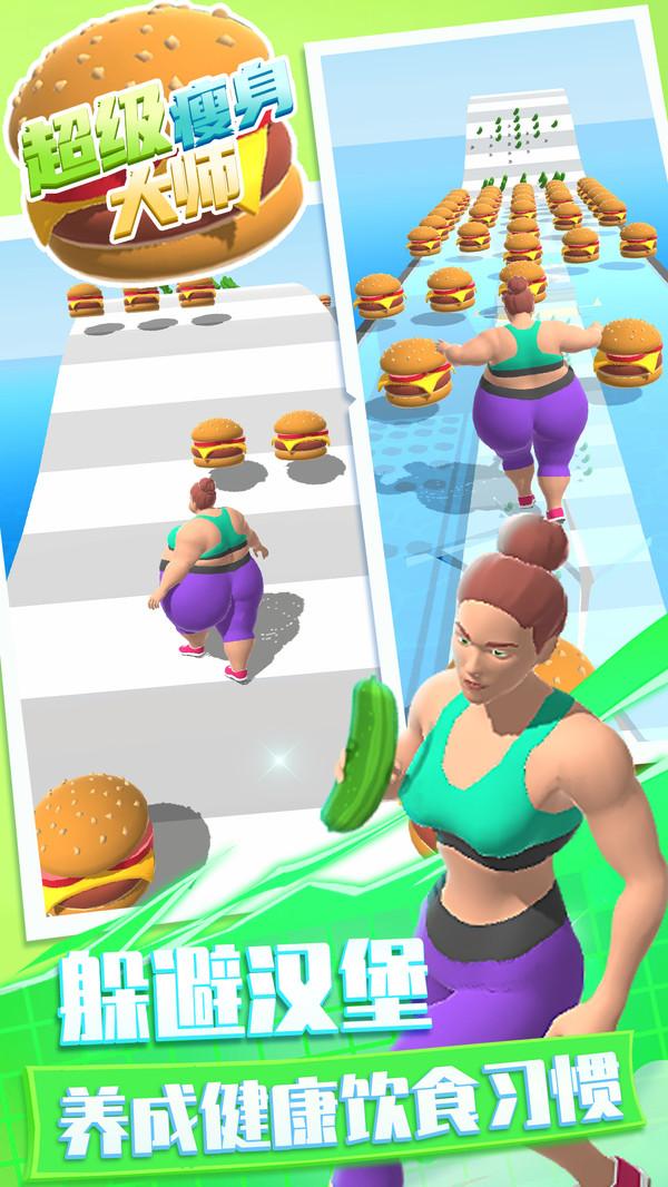 超级瘦身大师游戏中文版是一款非常好玩的休闲闯关游戏,玩家在游戏中将控制自己的角色进行不断的冒险闯关,沿途中有很多汉堡等高热量食物玩家需要及时的躲避他们才能达到瘦身的效果。