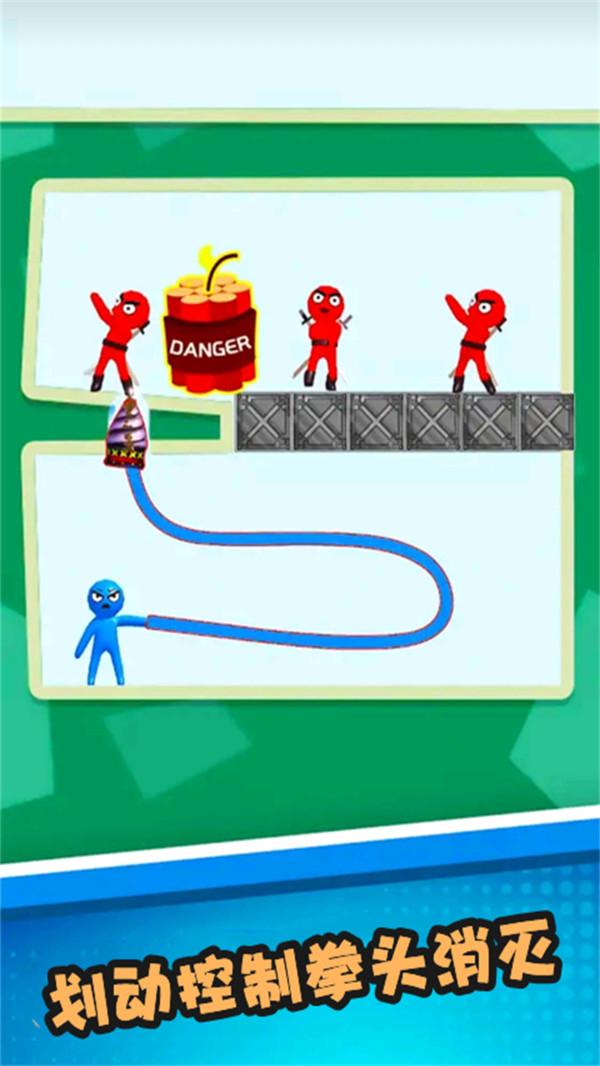 天神无敌是一款休闲闯关类的游戏,小蓝橡皮人有一样特异功能就是能伸缩拳头,拳头还能转化成各种武器,来击败闯关路上的阻碍小红人,控制伸缩手臂的方向解决小红人,来取得关卡的成功通过,操纵简单,快来下载吧。