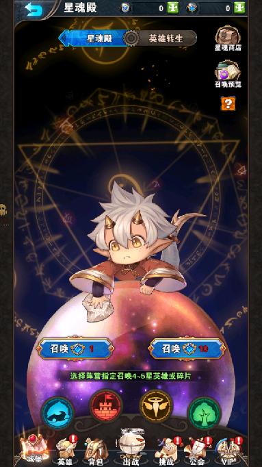 除此之外还有星魂殿可以召唤,星魂殿的召唤比较特殊,它可以召唤指定的阵营英雄,当然,星魂殿的召唤条件前提得拥有星魂币和星魂水晶,这两种的获取条件难度比较高,有兴趣的玩家可以留意下游戏内活动。