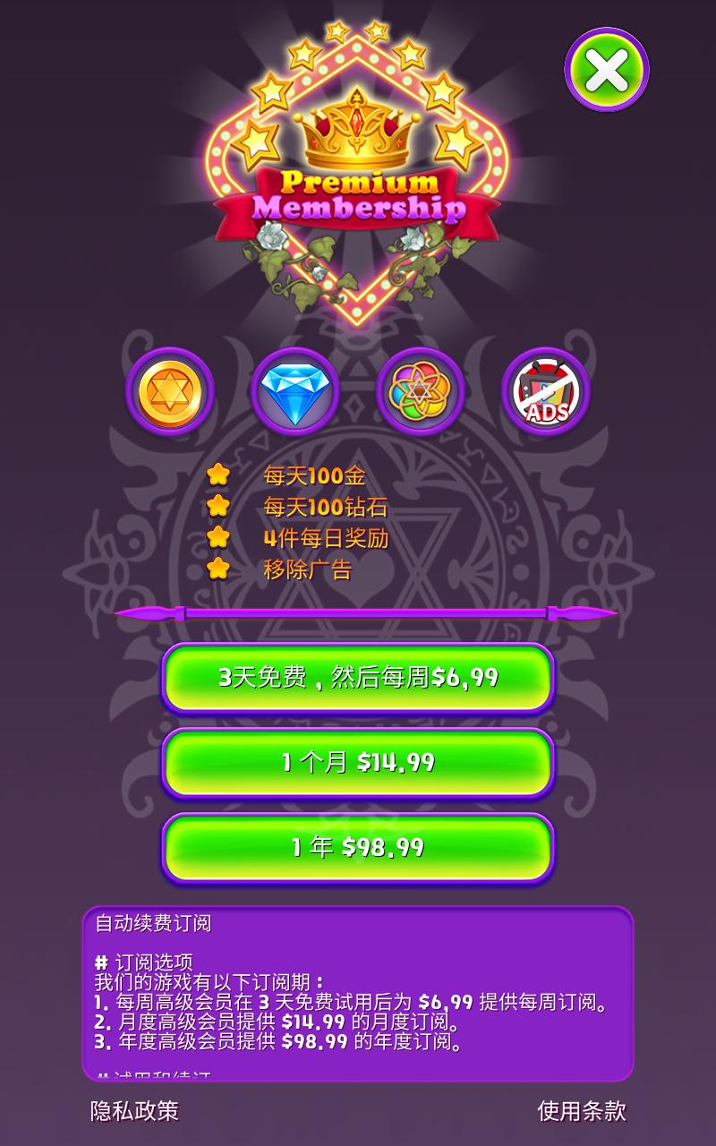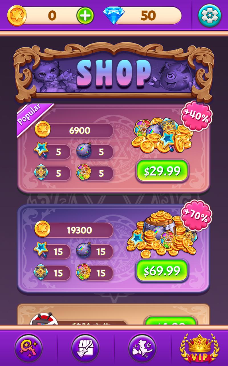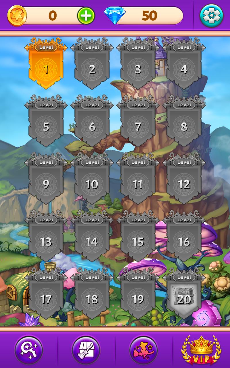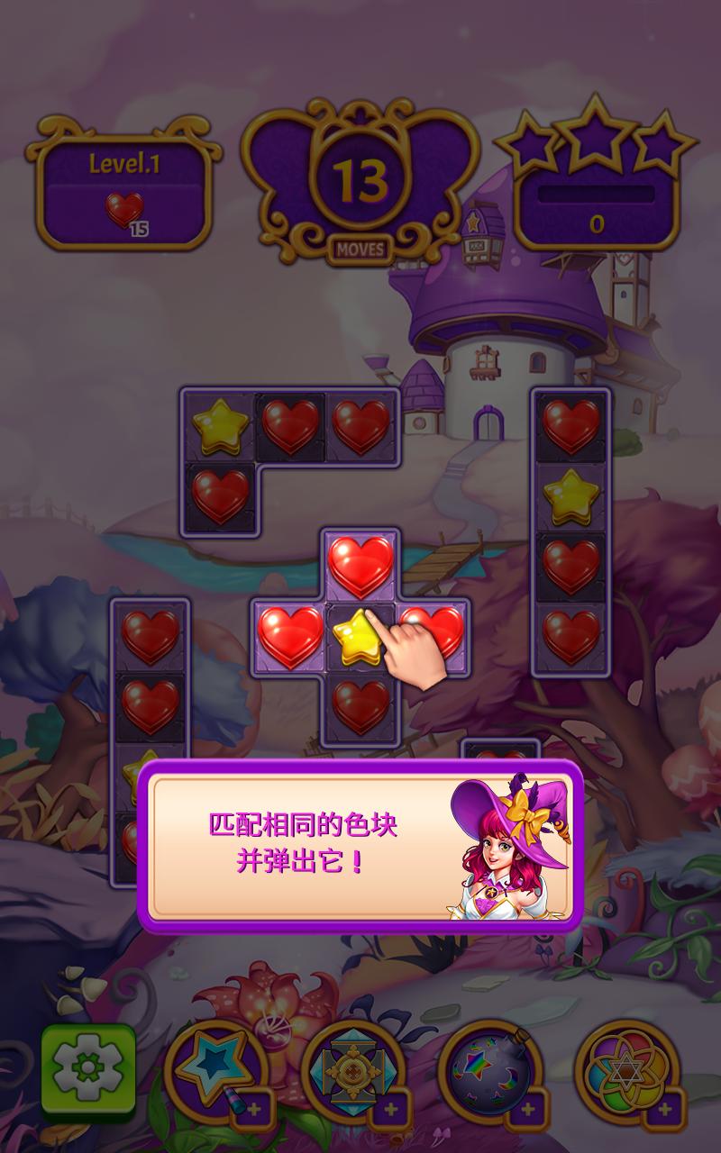 1.与女巫一起冒险,穿越魔法世界、冰冻海岸和糖果国,接连匹配三个,解开游戏中所有谜题。