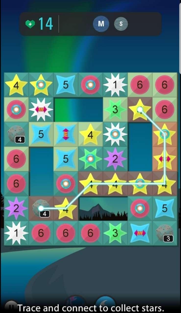 拼图中有六种“星尘”,从一级星到六级星。如果你追踪三个或更多相同类型的星尘,它们会消失,更高的星尘会出现在它们的位置。