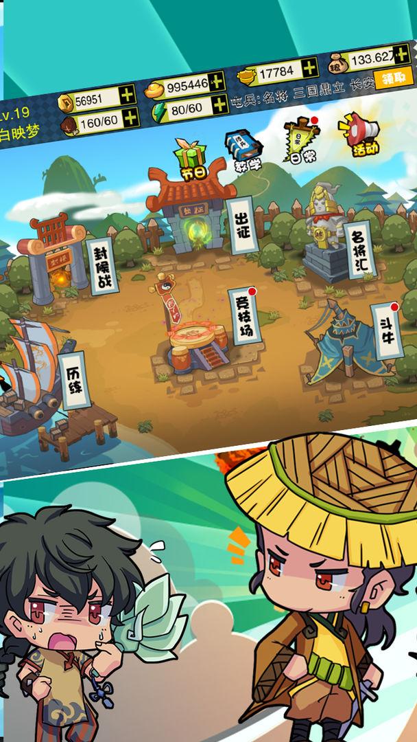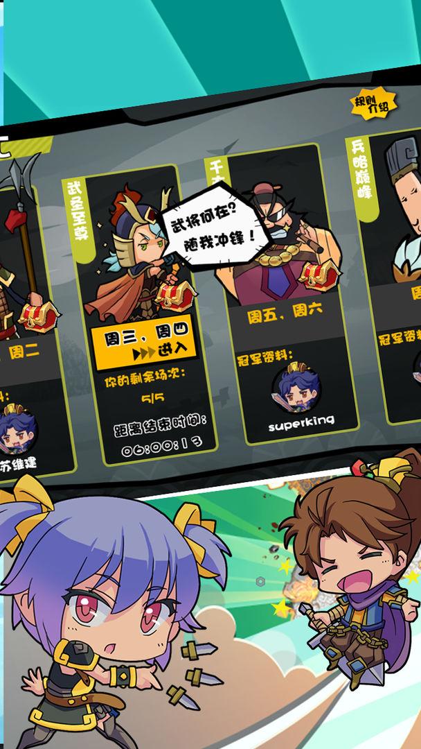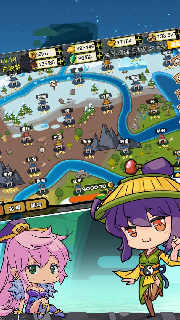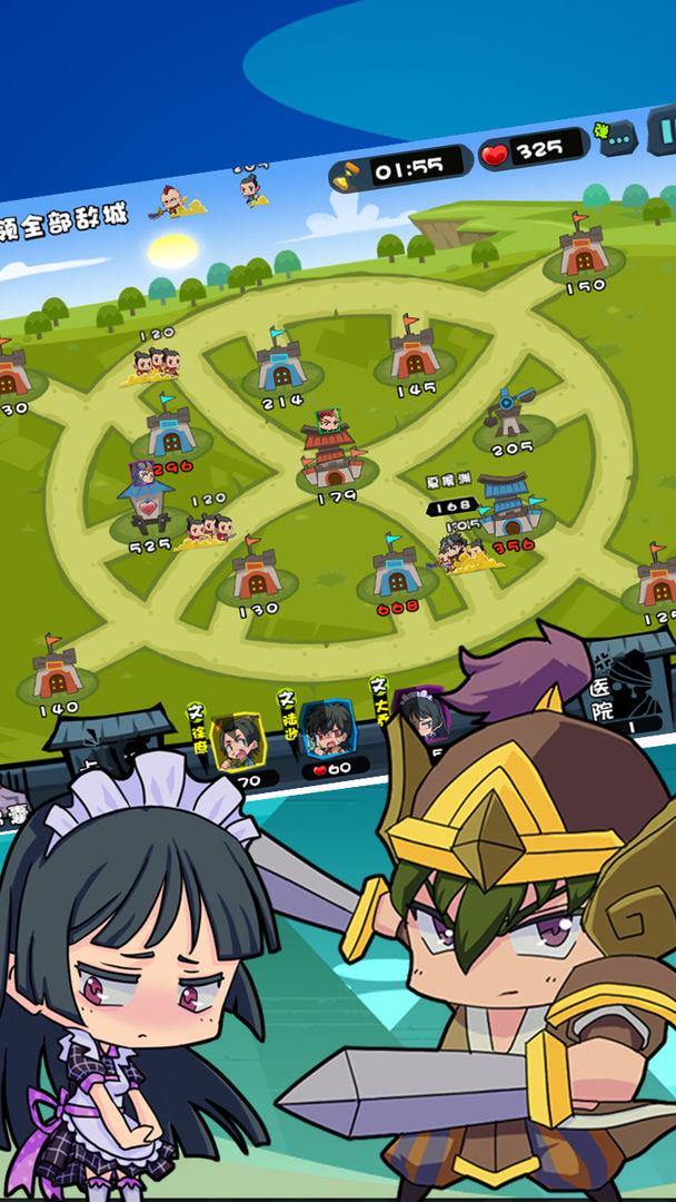 一款Q版风格的即时塔防策略游戏。以三国人物为背景,真实模拟战场,集养成、即时、策略于一体,独创的攻城略地玩法,配合不同类型的文臣武将,迎接PVE与PVP的挑战。横扫全国,统一霸业不是梦想。不一样的三国人物,不一样的感受,真正让玩家体验到不一样的爽快感、成就感的全新三国世界。