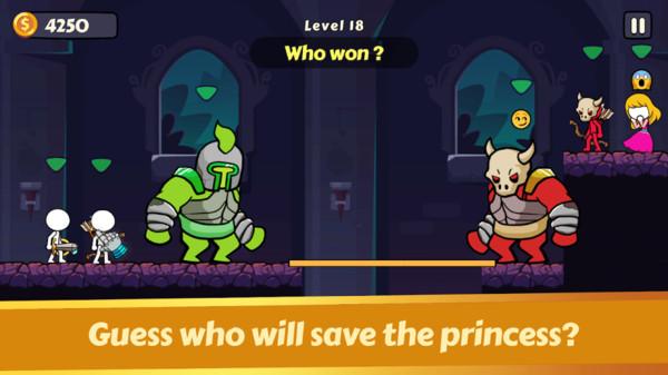 猜猜谁先死是一款趣味休闲类的游戏,内有丰富的关卡,勇士和魔王进行决斗挑战,猜猜谁先死呢,打开你的脑洞,幻想一切皆有可能的结果,关卡内陷阱多多,反转多多,魔性又好玩,还不快来下载吧。
