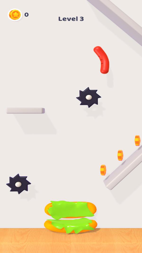 摇晃香肠是一款非常有趣味的休闲冒险游戏,玩家在游戏中需要控制一根香肠沿着墙壁和平台移动,收集平台上的金币,并让香肠掉落到三明治上面,注意有很多的机关陷阱,您需要小心的避开,也不能让香肠落在地上,否则您是无法通过关卡的;