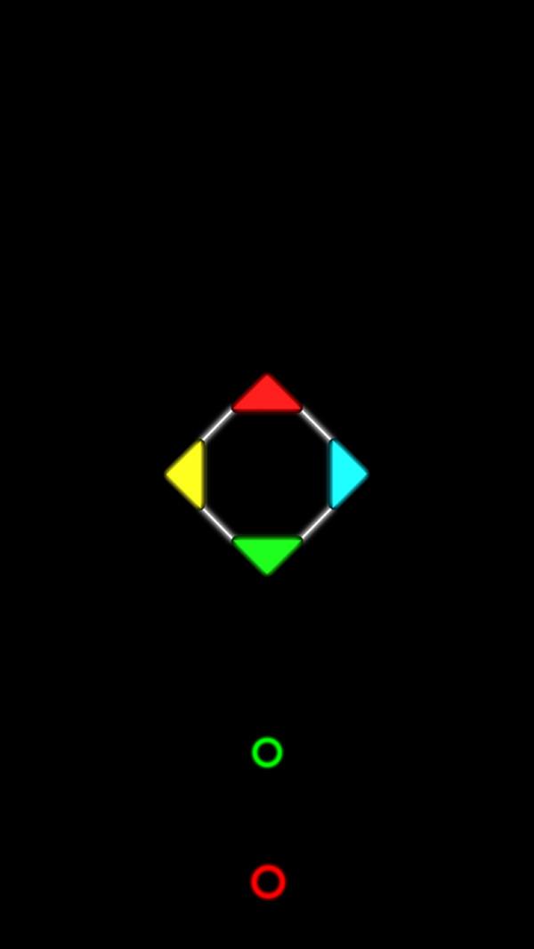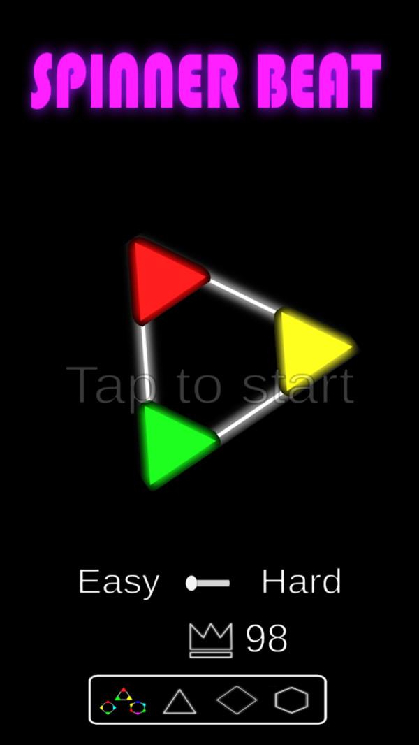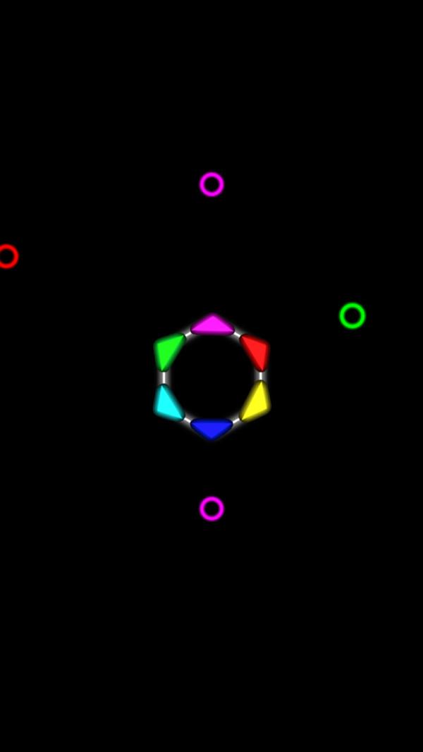 旋转节拍是一款休闲娱乐类的一款游戏,简单的画面设计以及简单的游戏玩法,但是不无趣。操控多边形上不同颜色的角,当有不同颜色的圆圈靠近时,用相同颜色的角去触碰,用不同颜色的角触碰时,即游戏失败,难度一步一步升级,速度和颜色会越来越多,挑战性越来越大。