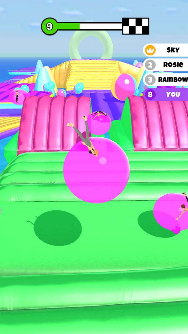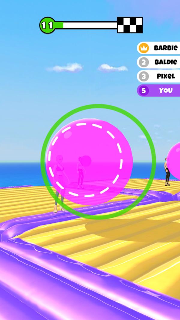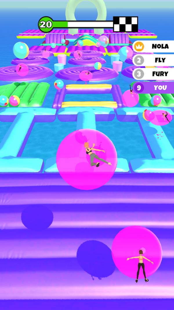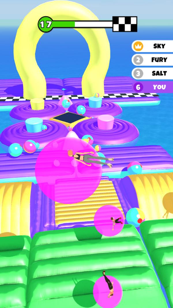 泡泡糖大作战是一款趣味对抗竞技赛,多人同赛道竞技,在游戏内吹了一个巨大的泡泡,把玩家都带动着飞了起来,玩家们在泡泡上控制方向,掌握技巧,在赛道上空飞行,可以去干扰别人的前行,也能自己往前冲!右上角会有个玩家实时排名。