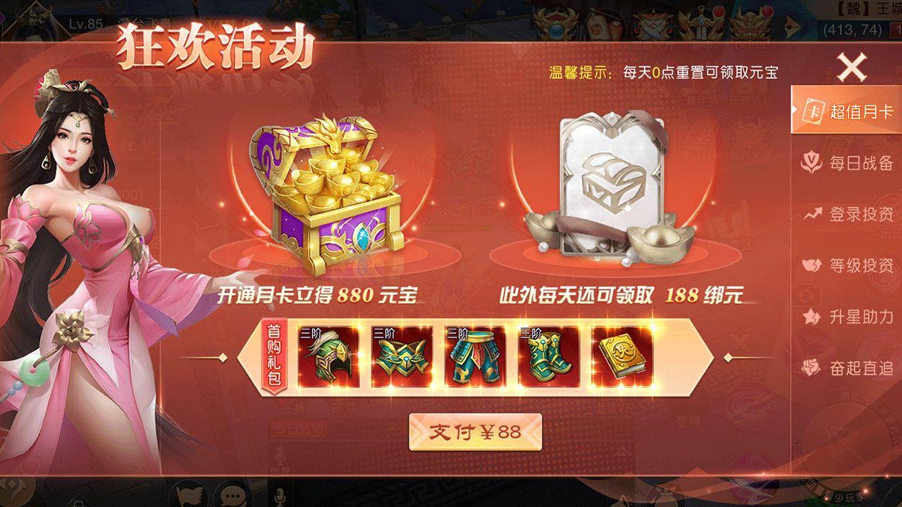 等级达到之后开启剧情副本,这是刷装备的好地方,剧情副本有多种模式,不同模式掉落不同。建议大家多扫荡几次炼狱本,这个副本很大概率的产出橙装。装备的加的战力比较多,这个是必须的。之后开启寻宝,寻宝可寻出满仙品属性的橙装,并且有一定几率寻出带有幸运属性的极品装备。精灵寻宝有多种萌宠等你来拿,萌宠不但属性给力,而且不同萌宠还可以组成不同的阵法,加成不同的属性,有的阵法还带有特殊技能。装备锻造也是必须的,强化装备前期建议强化武器和饰品,防装够用,攻击有点缺。升星也是一样的。进阶可以把打到的低阶装备进阶到高阶,所以打到低阶的好装备不要回收,记得留着。通天塔可以打到附灵材料,附灵不同装备加不同的属性。在打怪的过程中,会掉落出各种颜色的卡片,这个一定不要丢了,等卡牌功能开启之后,你可以用掉落的卡牌碎片激活对应的卡牌,这个不单单只是收藏,还会加战力。多余的卡牌碎片可以放到市场,或者世界喊话和别人换取自己的。