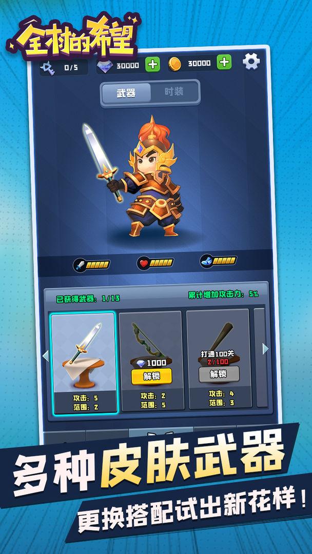 全村的希望这个梗之前非常的火,全村的希望手游则是一款玩法偏休闲的冒险闯关小游戏,游戏以勇士冒险为主题,讲述了智勇双全的你带着全村人的希望勇闯险境的故事,同时还有超多的武器和皮肤等你来解锁!