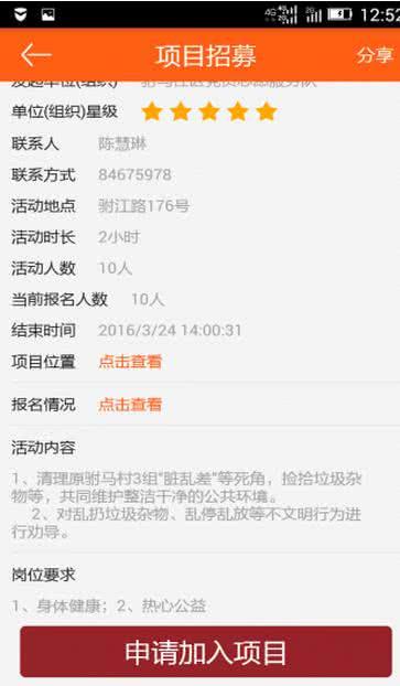 2.志愿者已加入的志愿服务队发布新的志愿服务项目后会接收到系统推送的项目邀请信息,点击信息可快速报名参与。