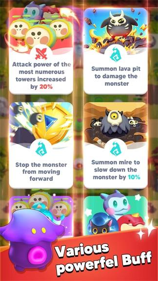 1、独特的塔防要素,玩家能够通过融合相同的生物来升级它们,并且强化他们的能力