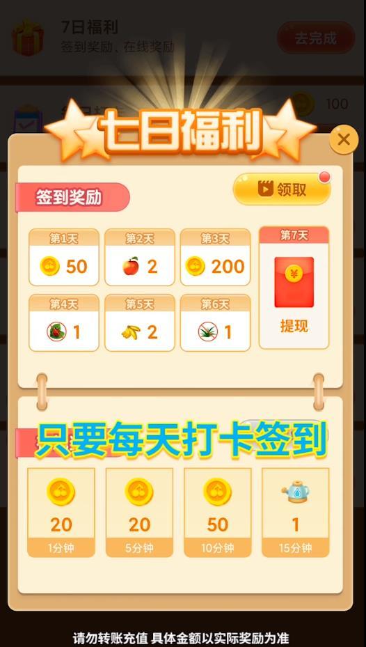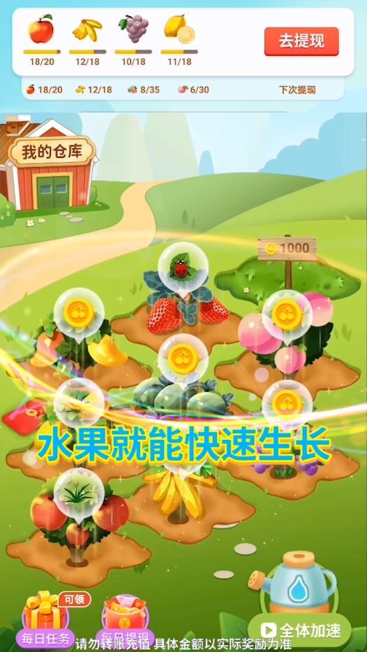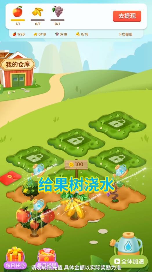 每天还有水滴可以领取加快果树的成长,长大之后就会有果子了,就可以兑换领现金了。