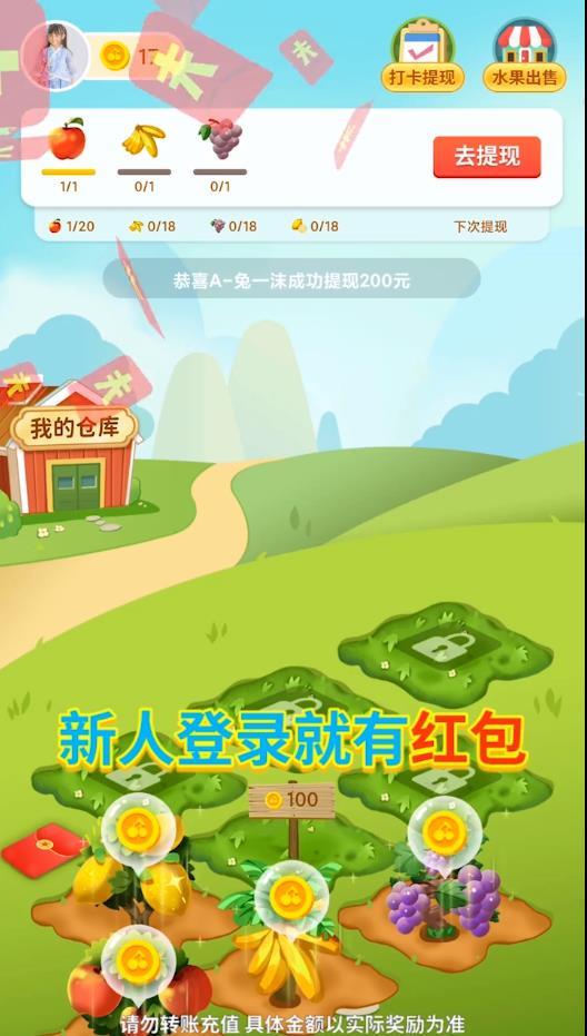 地主果园让你可以轻松进行果树的种植,游戏操作是非常简单且休闲的,你只需要花点闲暇时间,进行浇浇水之类的,就可以进行果树的种植操作,而且种植果树还可以赚取红包,随着红包的不断积累,就可以进行提现操作了。