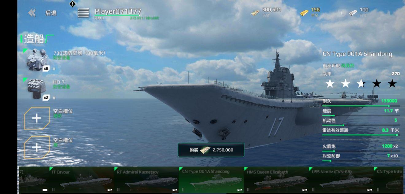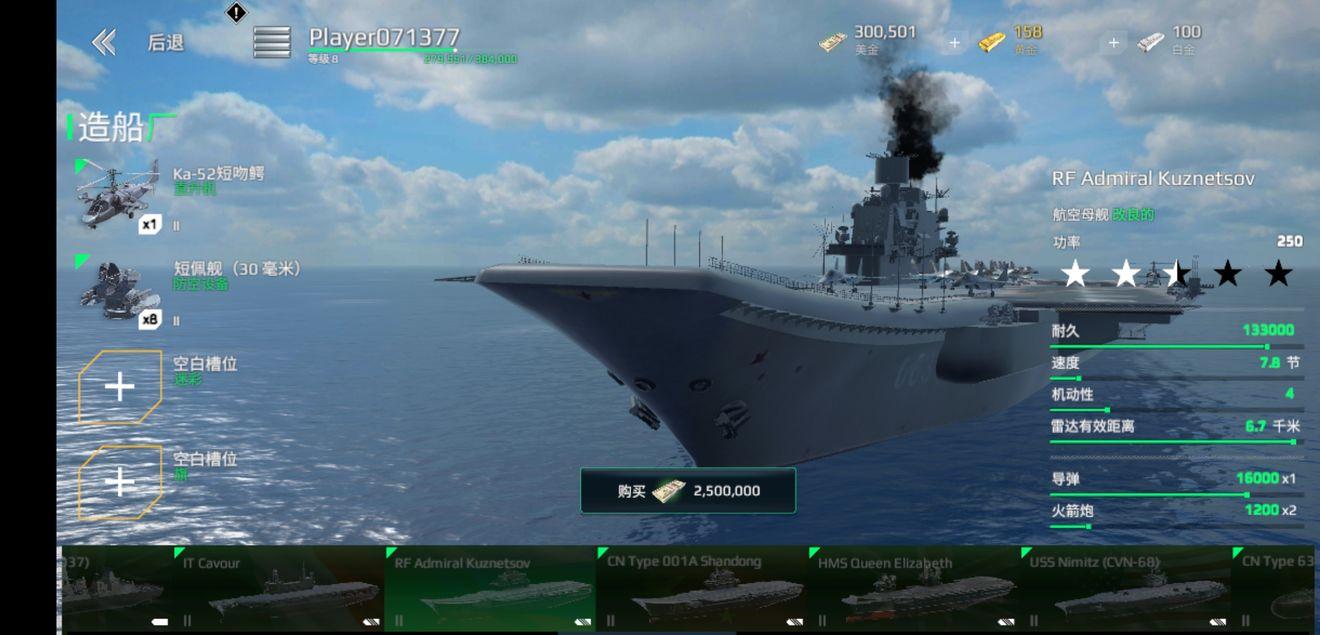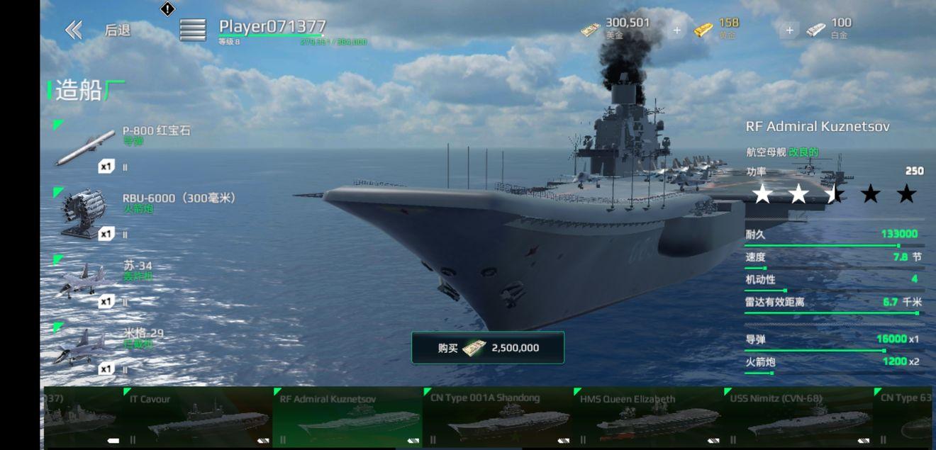 关于那两条前期航母...... 库茨涅佐夫拥有舰载导弹,加强中远距输出,山东舰比库舰多一座火箭炮和防空设备,速度更快,防空更强,近战尚有一战之力,战场生存能力更高,但没有库舰的舰载导弹,而且库舰比山东舰便宜,所以库茨涅佐夫和山东哪个更好就仁者见仁智者见智了,或者你再肝多三十五万买尼米兹也行(航母小知识:战机起飞后虽不可降落,但可飞回航母上空瞬间补满血量和弹药,战机中美系最强)