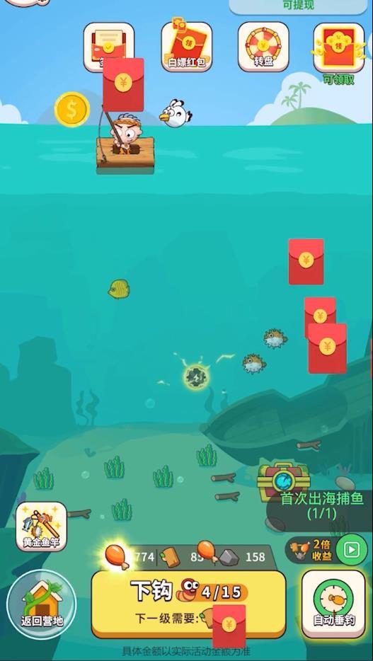 游戏中玩家们需要在海洋中来获得随机的生存资源,开局先钩物资,做出钓鱼竿,做出鲨鱼饵。