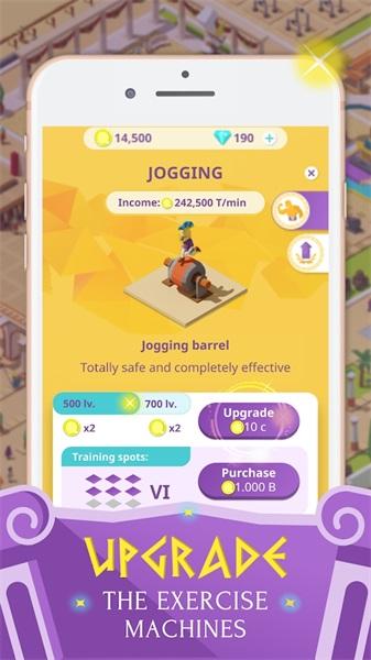 3、玩家在拥有了一定的资金之后就可以将自己健身房中的器材进行全面的升级,将自己的健身房打造的更加高级来为自己赚取更多的资金。