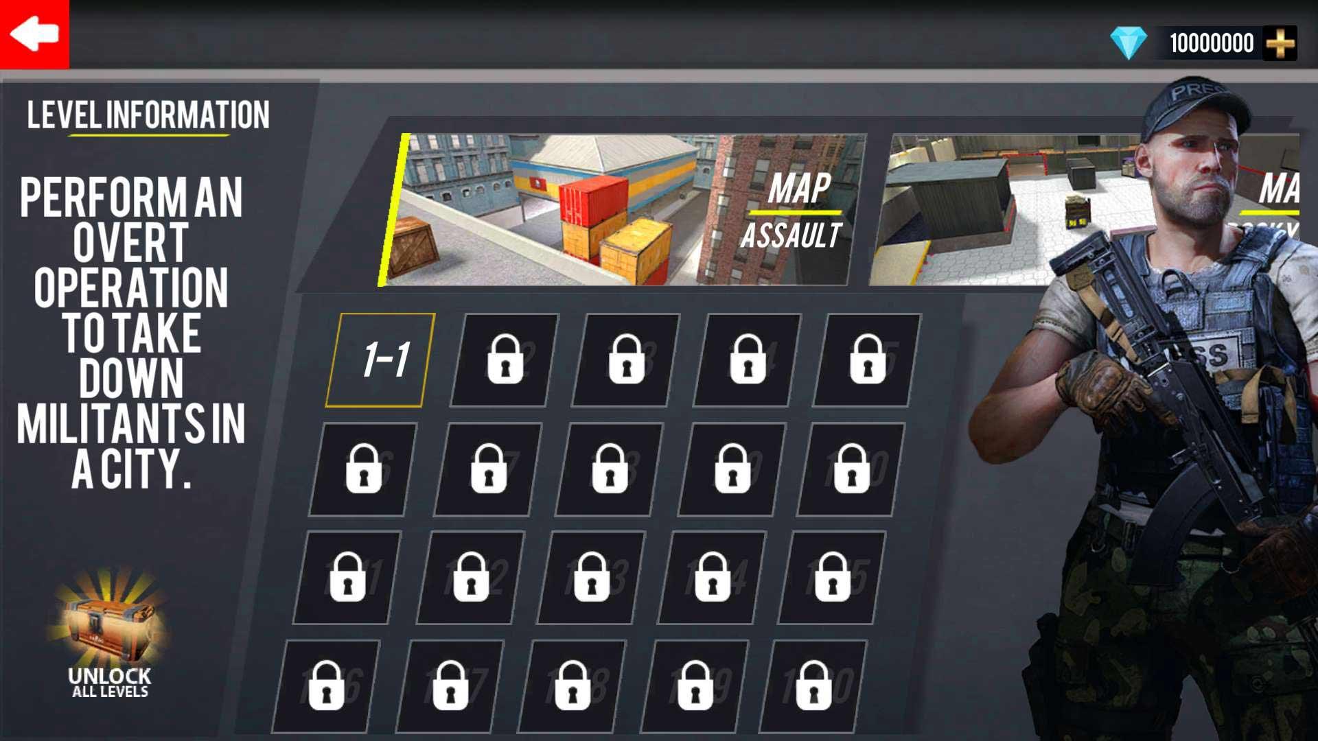 突击队枪击是一款经典枪战玩法的休闲小游戏,游戏修改无限钻石,进入游戏即可获取。这款游戏的玩法很经典,玩家在游戏中将会成为一名优秀的士兵,消灭所有的敌人即可成功通过游戏关卡,复杂的战场地形,多样的枪支武器,都能带给玩家满满的趣味体验,对这种玩法感兴趣的小伙伴赶紧下载游戏来玩吧。