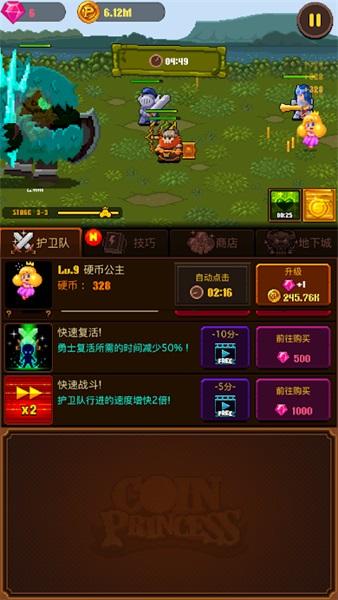 游戏操作也很简单,触控画面的任意一处,公主就会制作硬币,我们需要更多的硬币来募集勇士以及升级,硬币也同时具有作为武器的攻击作用,不断的点击屏幕就可以了,公主还可以召唤巨大硬币(相当于大招),还可以进入商店购物来提升自己(不过这都啥,看广告来获得硬币?)底下也有广告,唉,扣分,扣分,画蛇添足。