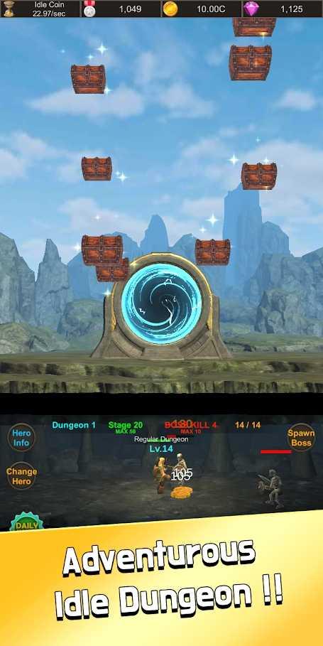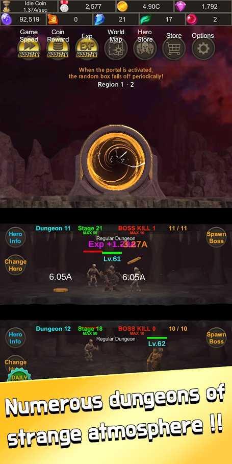 闲逛地下城破解版是修改了游戏的货币属性,玩家进入游戏就能够看到是有着大量的金币能够直接使用的,这是一款玩起来相当的休闲好玩的游戏,游戏中你将能够体验到非常有趣的玩法,通过简单的点击的方式不断地获得成长,放置完全不需要花你的时间,非常方便。