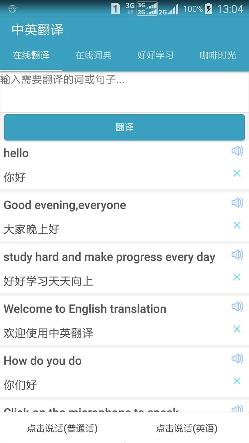 1、在线翻译。语音输入,语音输出。中译英、英译中。