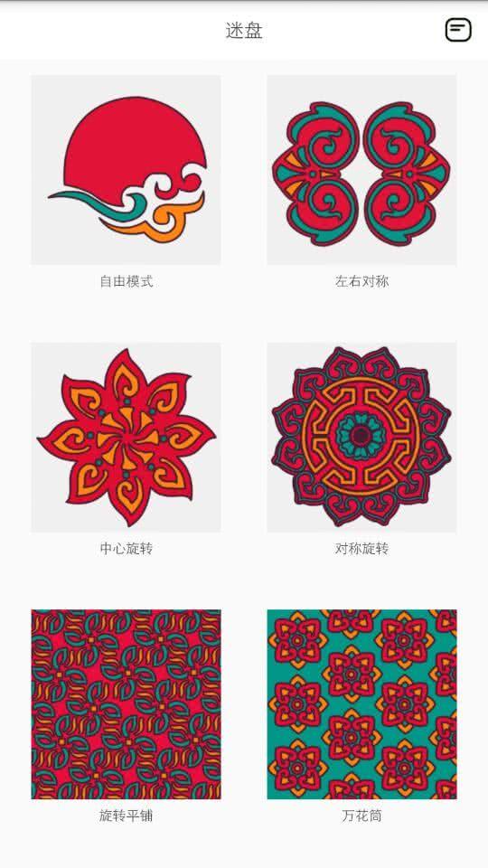程序中提供了7种不同的绘画形式,有自由模式、左右对称对称、中心对称、对称旋转和平铺的方式,将万花筒的原理呈现于您的每一个线条,形成完全不一样的图案,每一笔落下都会给您带来不同的惊喜。完美的体验将颠覆您对所有绘画工具的看法,画面的未知与流畅感使您舍不得离开迷盘。移动的终端使您更加方便,随时随地尽情创作,畅享迷盘带给您的乐趣。使用迷盘进行无意识创作的成品,不亚于市面上的工艺品,甚至可以将其定制成为生活用品和摆件,为家中增添更多的生活情趣。