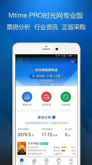 时光网专业版是时光网基于海量数据库基础上推出的一款包含最丰富的电影衍生品,和最全面的电影票房数据分析的移动端应用。提供最新最热的电影衍生品采购、同时涵盖影片、影院、院线的实时票房、实时排片等维度的对比分析功能。