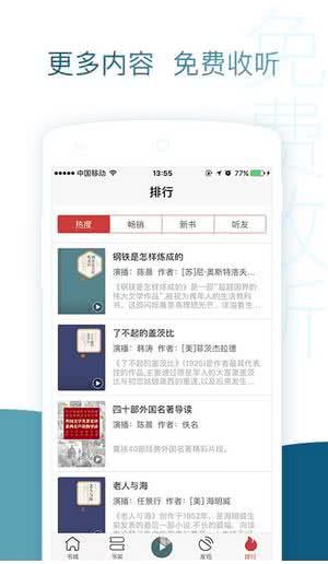 去听,中国出版集团旗下专业听书客户端。聚合了全国各大出版社各类优质正版书籍资源,为您制定阅读“好声音”的标准,让您畅听中外名著,品味国学新知。