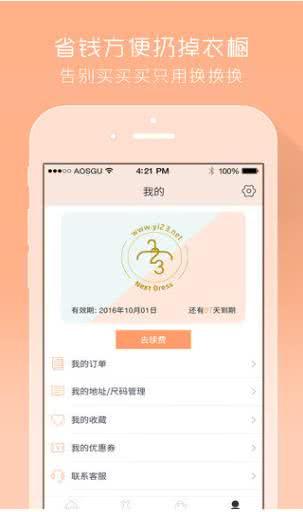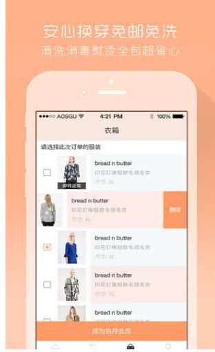 免运费,往返快递均包邮,配送新的衣箱取回上次穿完的衣服;免除押金,购买包月会员服务无需任何押金。