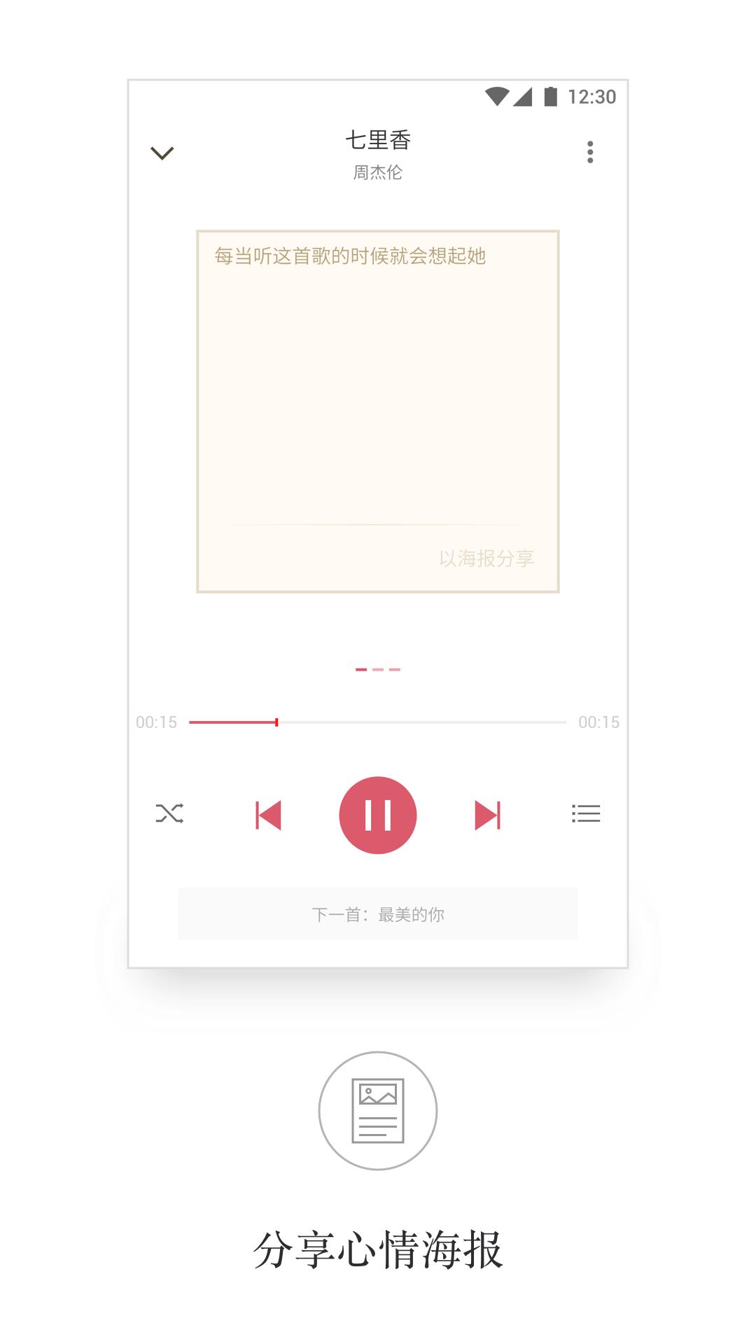 在播放界面左滑,我们为您准备了一张便签。总有一些歌曲让我们想起一些人和事,这时您可以打开播放器直接记录下来。同时还可以以海报分享到朋友圈哦。