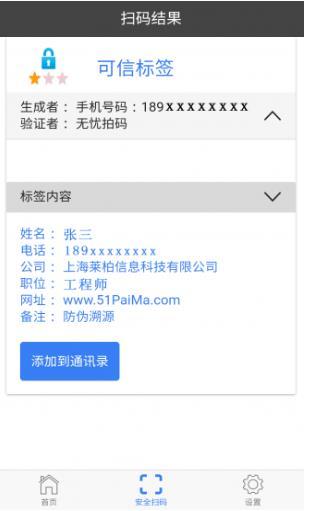3. 手机一拍,马上获知二维码、NFC生成者的真实身份,不法分子再也无机可乘