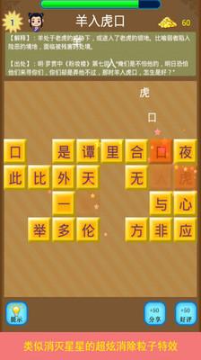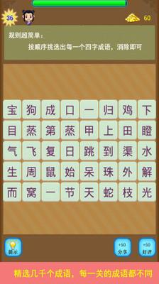 一个个的导弹伴随着成语从天而降,玩家必须要在炸弹落下来之前填补成语中缺失的文字才能将其摧毁,否则会被炸弹伤害到。游戏分关卡,每一个关卡都会有一批成语炸弹从空而降,玩家每打完一批成语便会进入下一关,随着关卡的提升,炸弹的数量以及速度都会越来越快。并且游戏对玩家的分数进行了排名统计,快来看看你的文学排名到底多高吧。