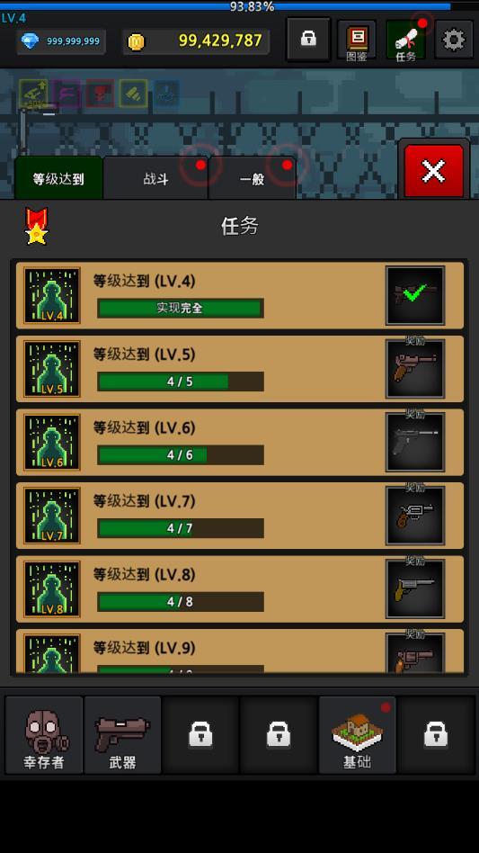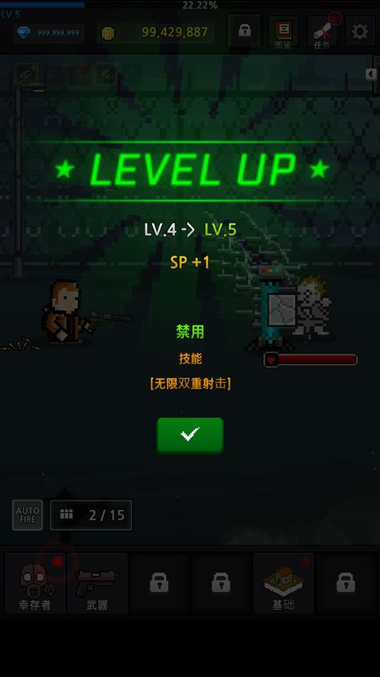 培养幸存者破解版是修改了游戏的货币属性,玩家进入游戏就能够看到是有着无限多的钻石金币能够随意地使用的,这是一款玩起来相当的爽快的像素风格的射击养成类游戏,游戏中你将要从各种方面来培养你的幸存者,在这个僵尸的世界中活下去。