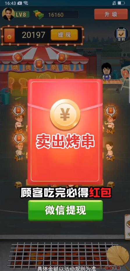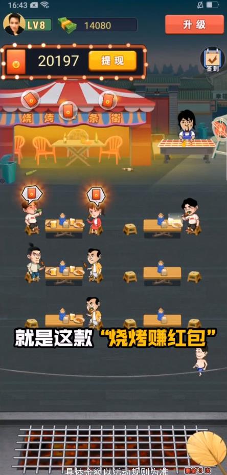 烧烤赚红是一款非常富有趣味性的以美食为题材的模拟经营类赚钱游戏,以经营一家烧烤摊为主要目的,不断进行多样烧烤的研发解锁,就可以赚取更多的收益,才能够让你的烧烤摊越来越大,生意越来越好,赚的越来越多,还有着红包奖励呢!