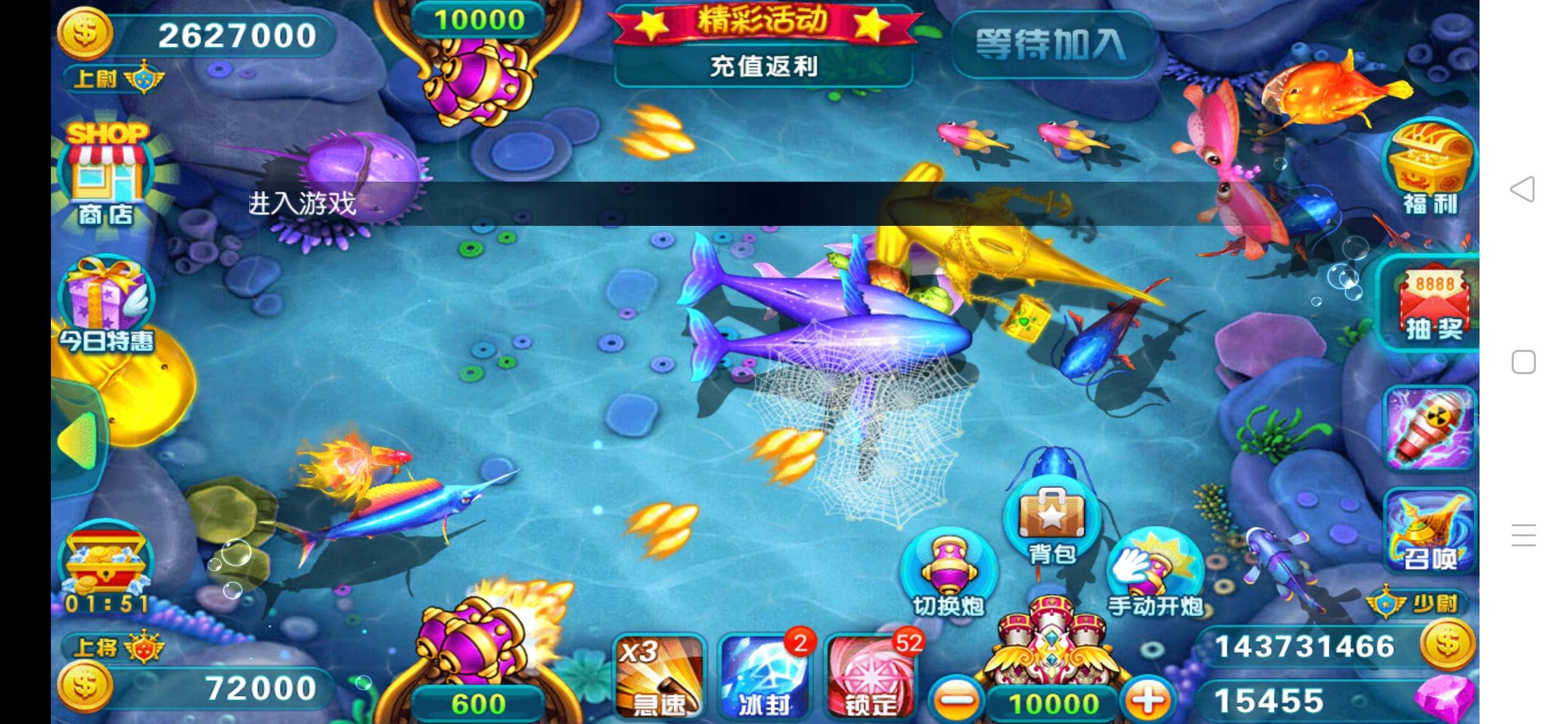 2、全新捕鱼技能,锁定、冰冻、自动、划鱼;