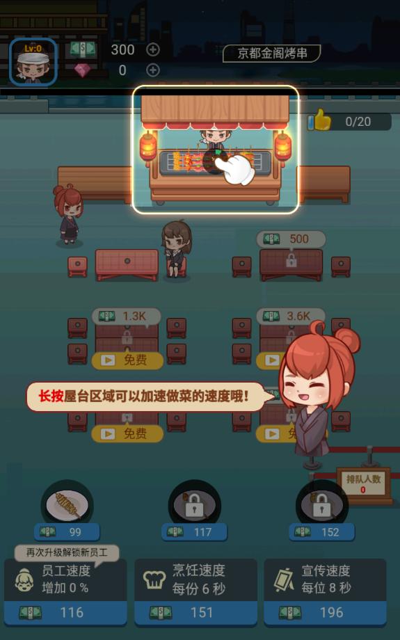 简单操作,轻松写意!通过点击升级来获得更多色味俱佳的烤品,升级服务员和厨师的等级,满足食客们的口腹之欲。