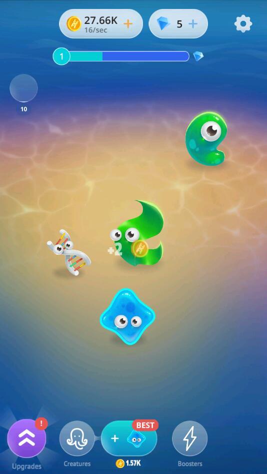 每过10秒在游戏中出现一个水泡,点破它就会出现一个非常卡通的DNA,用两个DNA就可以合成细胞了。游戏中有非常多的生物,都是通过下一级别的合成而来,玩起来非常的需要时间,如果需要进化成人类就需要很久。