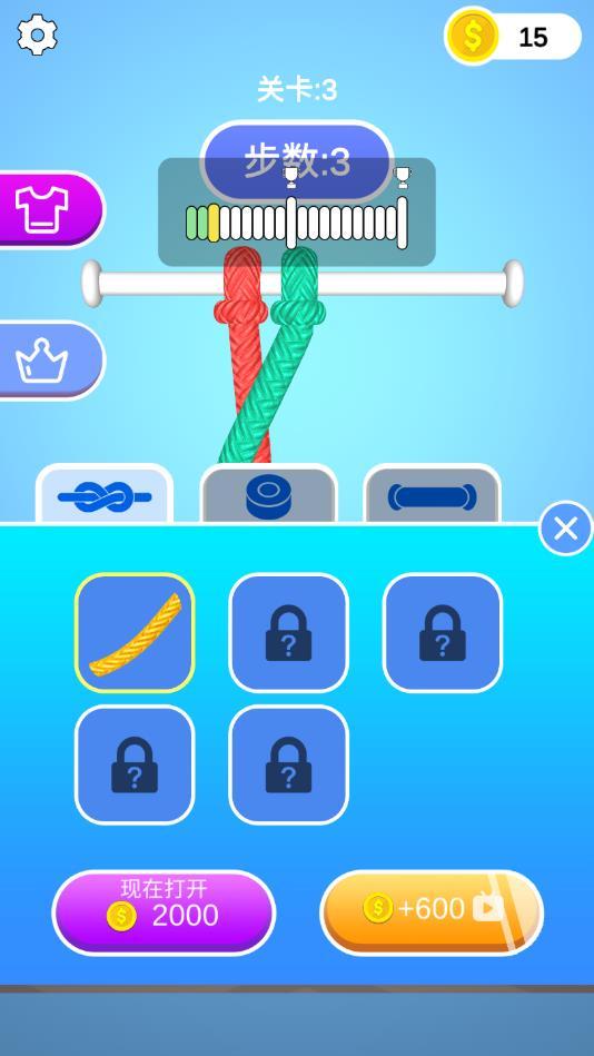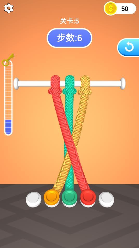 每个关卡都有不同的绳结,玩家需要观察,而且是3D视觉,玩法简单,几分钟就能轻松搞定。
