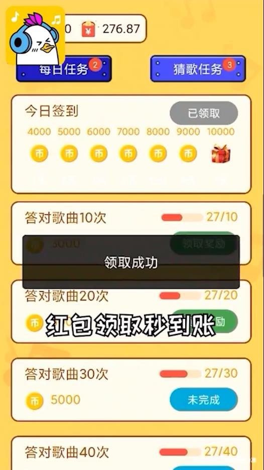 只要不断猜歌,完成对应的任务,就可以获得足额的红包哦,来一起加入吧。