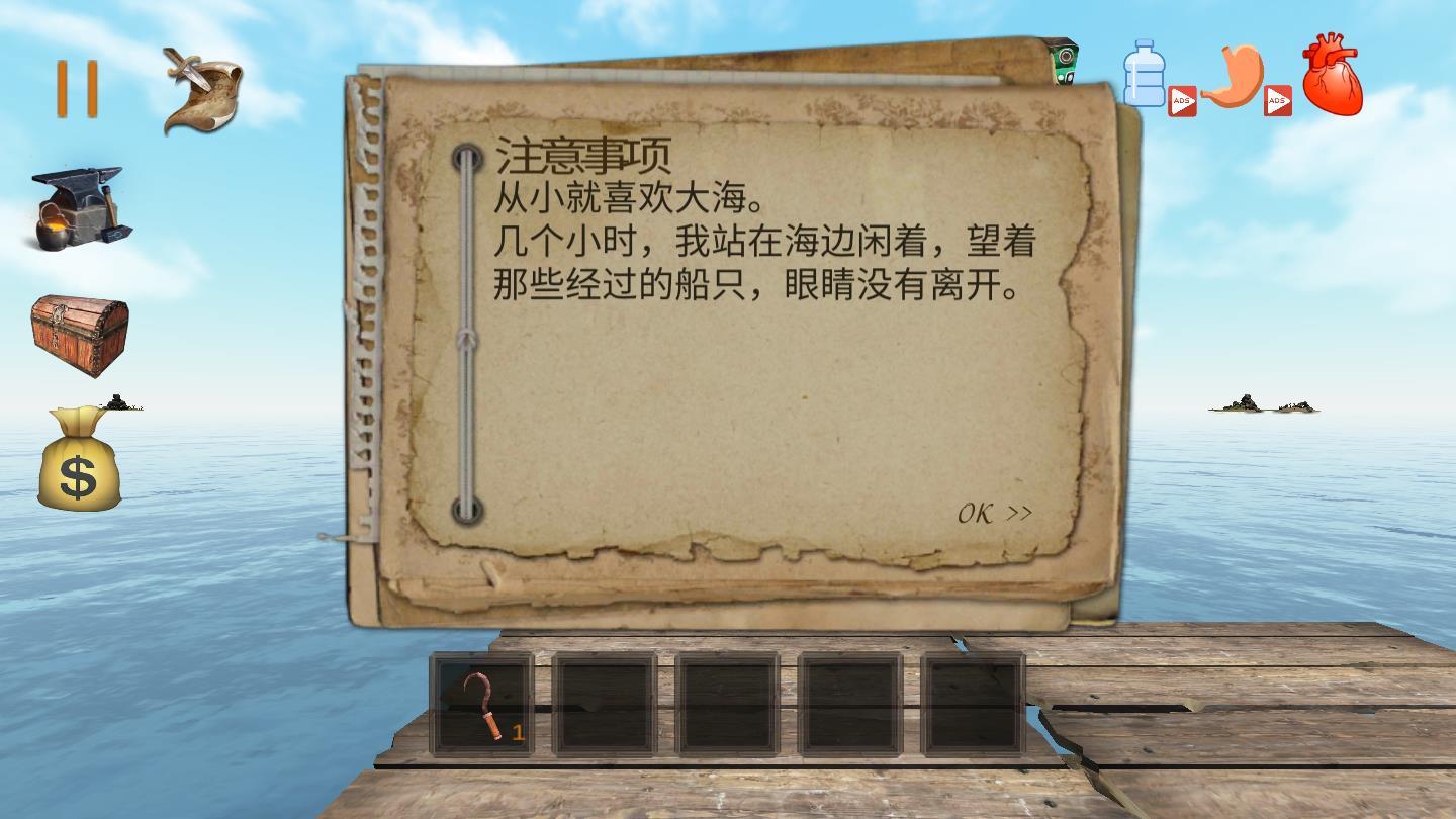 游戏最初生存的主要工具就是固定的皮钩了,所有的东西都需要用这个来获取,建议新手玩家首先不要渠道海洋中,鲨鱼回把你吃掉;