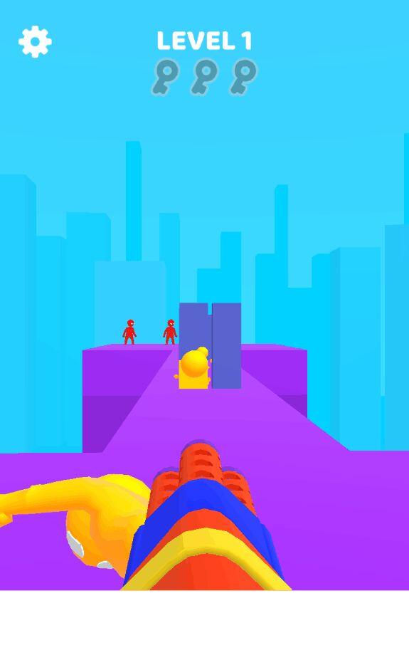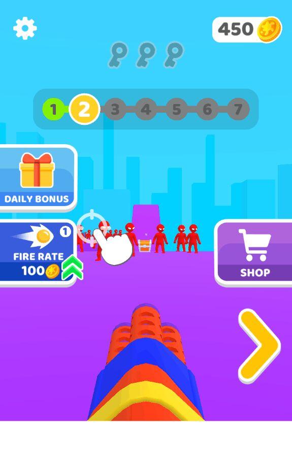颜色射击(强制购买皮肤),玩家买皮肤不用金币,进入游戏玩家可以看到我们的主角拿着枪,有很多的小人向你冲了过来,这个时候玩家的玩法也很简单,那就是用你的枪扫射它们,为它们重新上色。