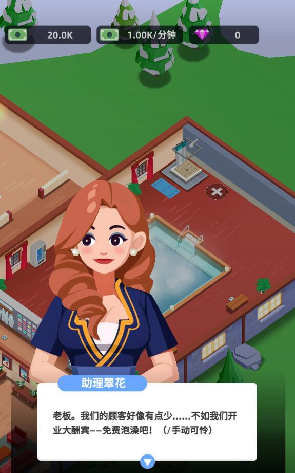 洗浴中心大亨免广告奖励版,不用看广告就可以获得奖励,进入游戏后会有人带领着玩家了解这款游戏的规则,然后上手告诉你应该怎么玩,之后玩家就可以选择按照自己的规划开始管理这所洗浴中心了。