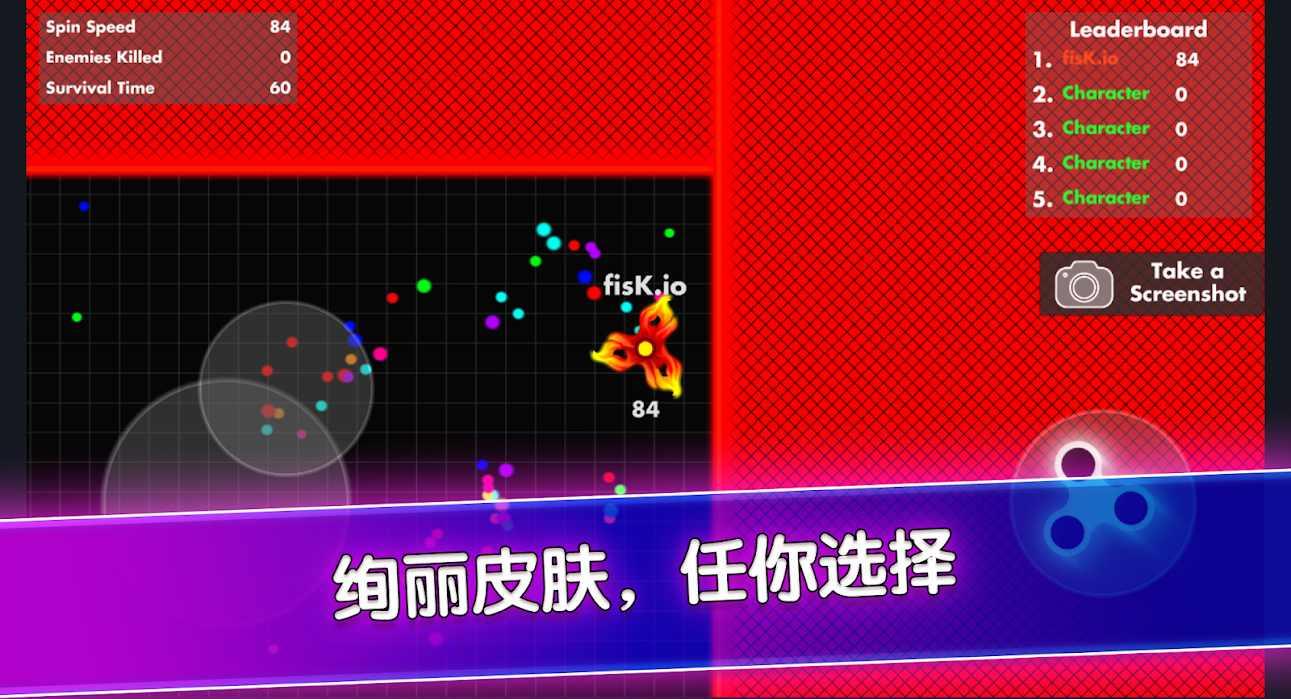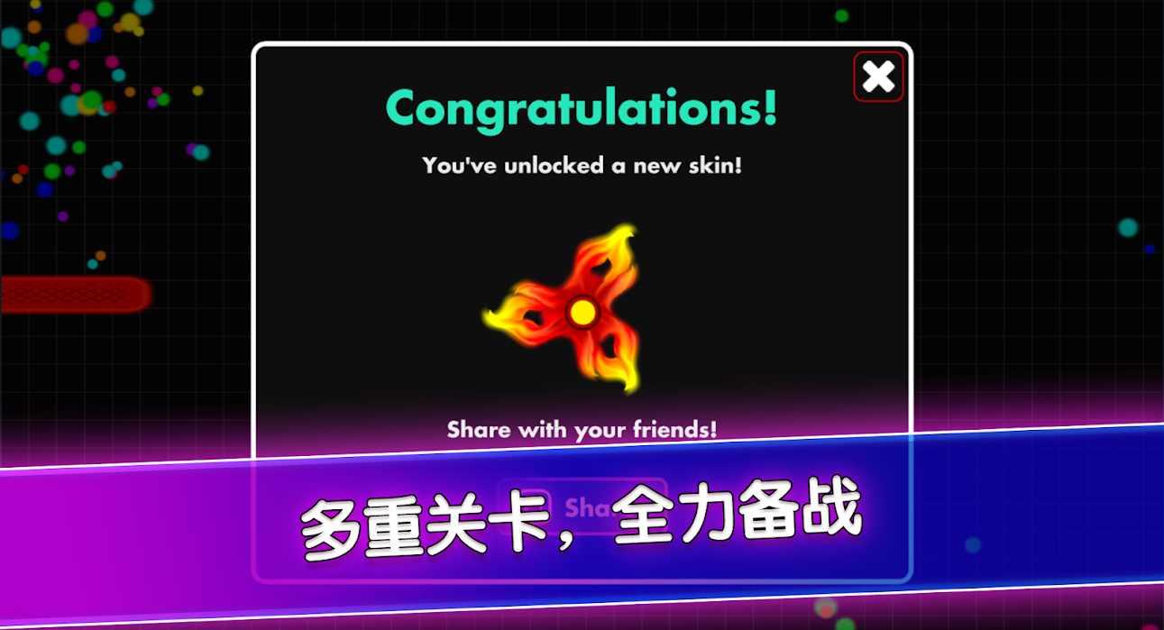 3、你要时刻让自己的陀螺变得无限大,同时你还可以利用各种酷炫的道具帮助你轻松制敌人。