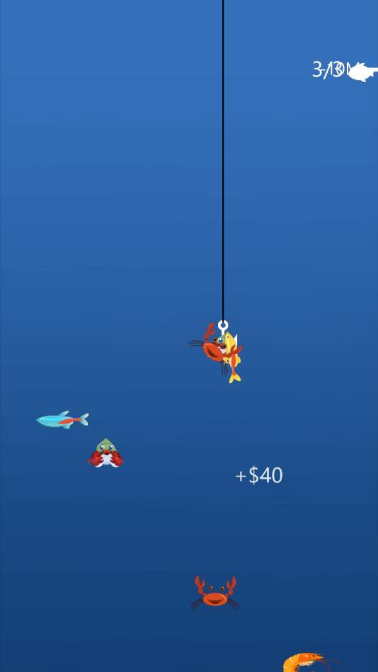 点击即可进行鱼线的放下,指尖左右滑动,能够控制鱼钩的方向,自由进行多样鱼的钓起,玩法非常简单且解压。