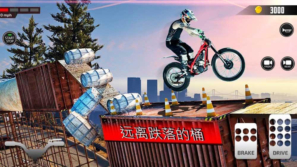 2、当驾驶疯狂的摩托车在空中坡道上更换齿轮精确控制速度,以完美平衡自行车;